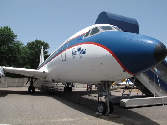 It houses an entire fleet of his cars, rows of sparkling jumpsuits, personal archives, and more. You can even step aboard his private planes—The Lisa Marie and Hound Dog II—both parked nearby. The Lisa Marie is especially iconic, complete with velvet upholstery, gold seatbelts, and a suede-covered conference table fit for a king.