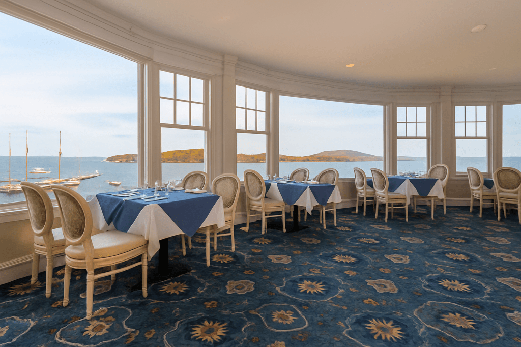 Evenings at the Reading Room Restaurant are unforgettable. With floor-to-ceiling windows overlooking Frenchman Bay, this fine-dining restaurant serves up both panoramic views and classic coastal cuisine. As the sun dips below the islands, the water mirrors the colors of the sky — pinks, golds, and deep blues — creating one of the most mesmerizing dinner backdrops in New England.