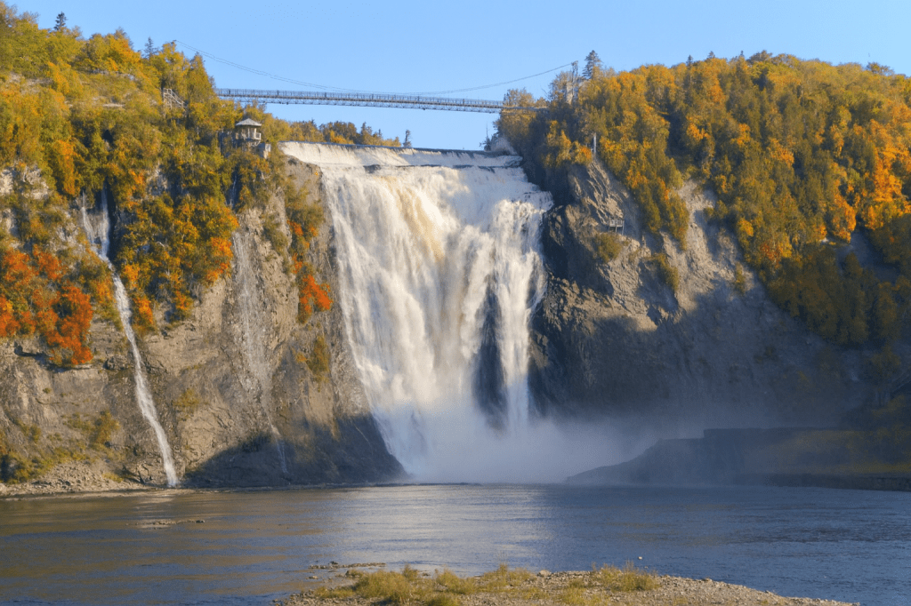 Only 15 minutes from Old Québec, Montmorency Falls towers 272 feet — nearly 100 feet higher than Niagara Falls. In autumn, the surrounding cliffs blaze with color, and mist rises through the gold-tipped trees. You can take a cable car to the top, cross the suspension bridge, or walk the scenic stairs for different perspectives.