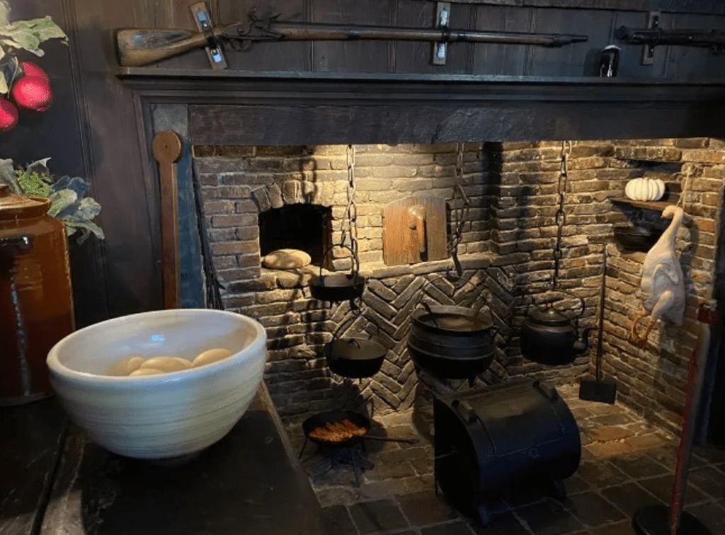 The kitchen is the largest and most fascinating room in the house. You’ll see a massive hearth used for cooking, drying herbs, and making candles. Hanging herbs and iron cooking tools illustrate how closely Puritan life was tied to both faith and folklore — sickness, bad luck, and poor harvests were often blamed on spiritual causes.