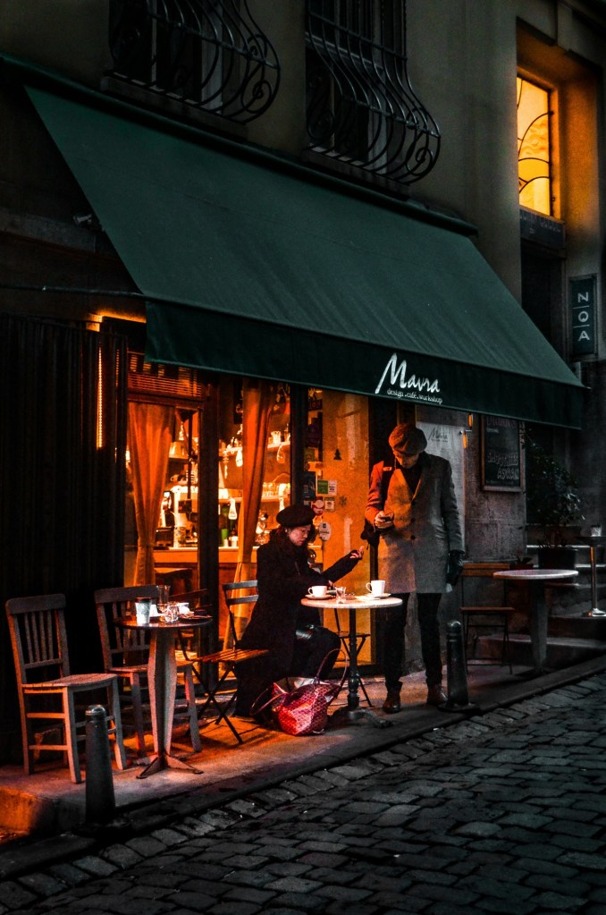 Passing a corner café where friends linger over thick hot chocolate.