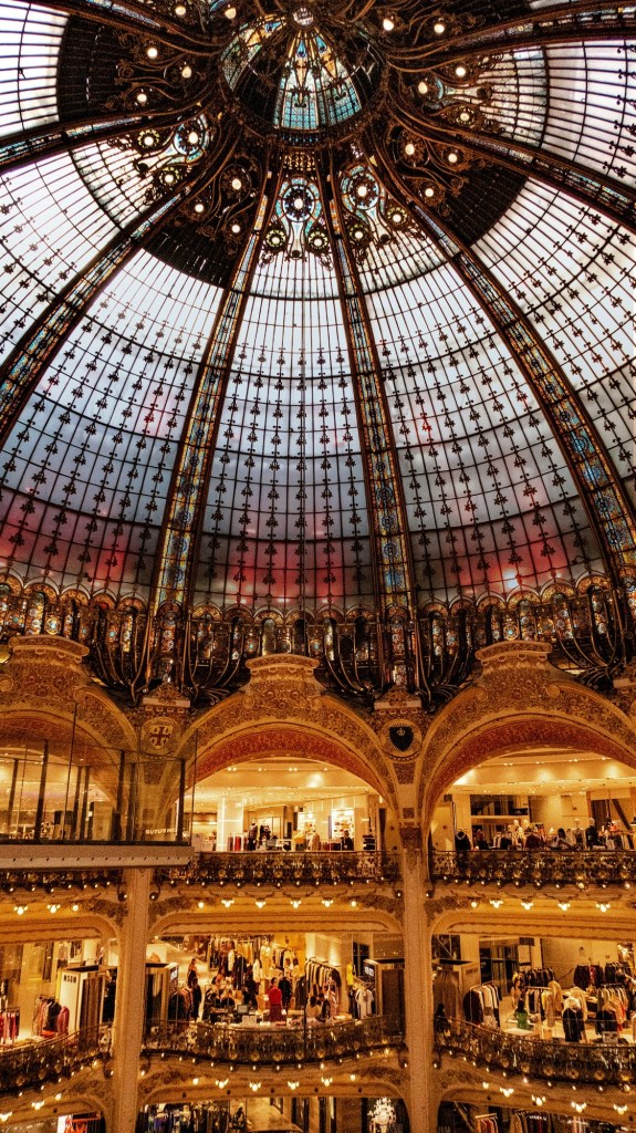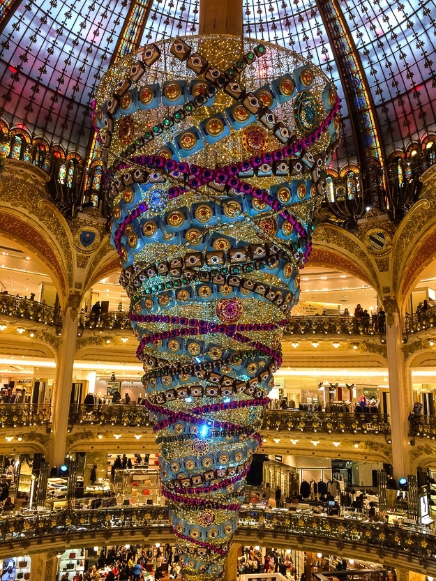 Galeries Lafayette is a must in December. Each year, its giant central Christmas tree becomes the centerpiece of the city’s holiday decorations, rising toward the stained-glass dome in a burst of color and whimsy. Crowds gather around the railing just to stare up in awe.