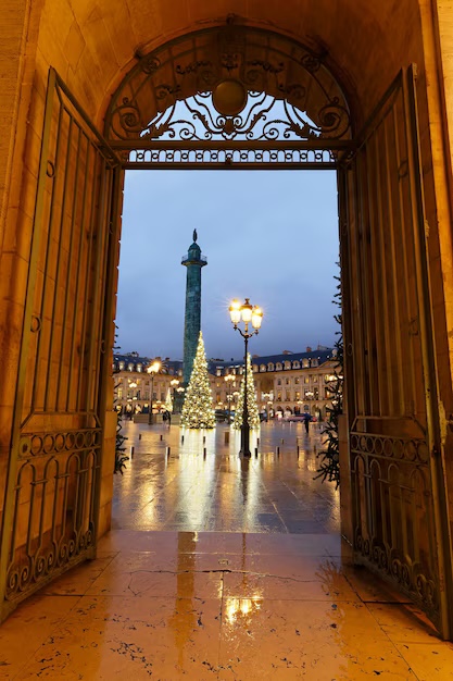 For something more refined, Place Vendôme glows with understated beauty. Perfectly trimmed trees line the square, and the golden façades of the luxury boutiques cast a warm light over the cobblestones. It feels elegant, peaceful, and undeniably Parisian.