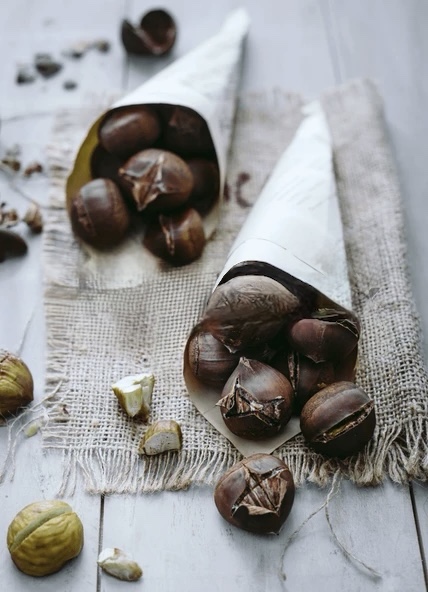 Roasted chestnuts in paper cones.