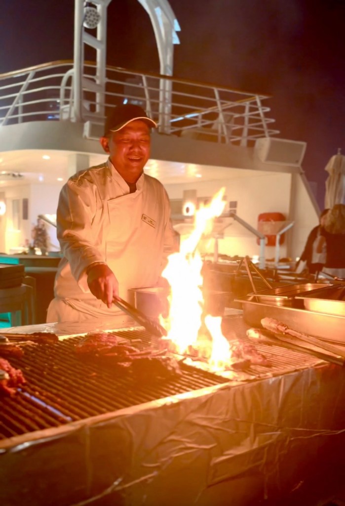 With the lights of Cartagena shining in the distance, the atmosphere was relaxed and social, filled with easy conversation and laughter. Freshly grilled dishes were enjoyed under the open sky as the city sparkled beyond the railings. It was a moment where being in port became part of the evening itself, offering a memorable connection to Cartagena without ever leaving the ship.