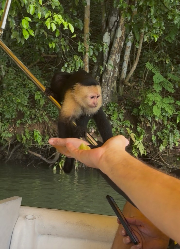One of the highlights was a journey through the Panama Canal, traveling alongside dense stretches of rainforest where wildlife appeared often and unexpectedly. Sloths rested quietly in the trees, while monkeys proved curious and surprisingly interactive, climbing into the boat and carefully taking limes from our hands.