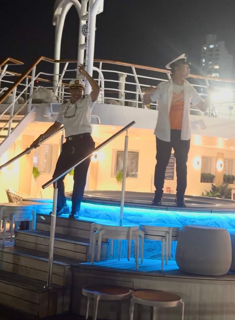 As evening approached, the city transformed. Lights flickered on across the skyline, casting a warm glow over the water, while the old city’s silhouette stood quietly in contrast to the modern buildings beyond. Cartagena has a way of feeling both energetic and romantic at the same time, a place where history and present day life blend seamlessly. Even from the deck, the sense of place was unmistakable, the city’s presence felt in every direction.