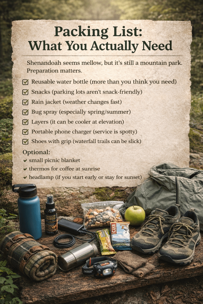 Get in early. You’ll catch the calm, the prettiest light, and you won’t be fighting for parking. Download offline maps beforehand because service drops constantly. Don’t try to “do it all.” Shenandoah is not a checklist park, it’s a slow-down park. Plan around sunrise and sunset (the Blue Ridge glow is unreal), and pack snacks since food options are limited inside the park.
